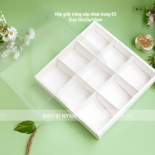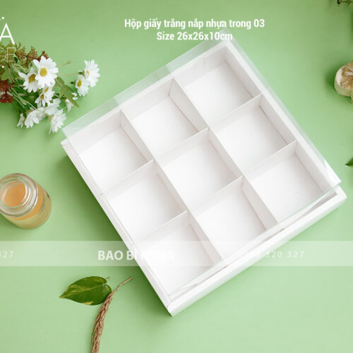Hộp giấy trắng nắp nhựa trong 03 – 26x26x10cm