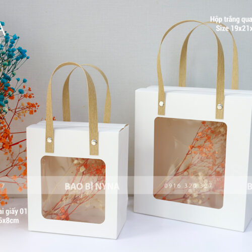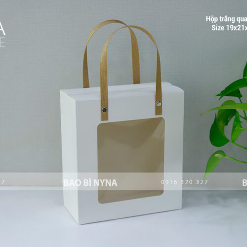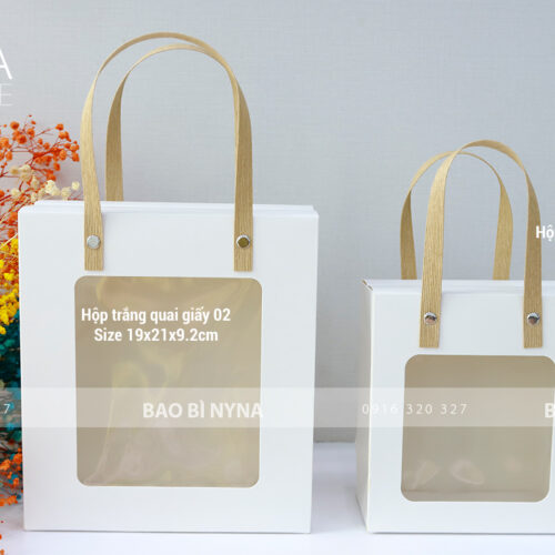 Hộp trắng quai giấy 02: ngang: 21cm x cao: 19cm x hông: 9.2cm